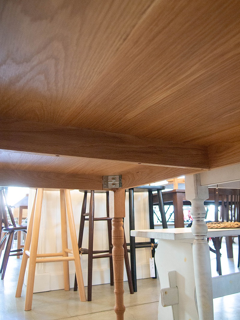 脚ははぎ合せでなはく1本の無垢材から削り出して作り上げましたのでこちらも美しい仕上がりです。また、古典的な構造の幕板にM8のボルトで固定する方式のためとても丈夫です。