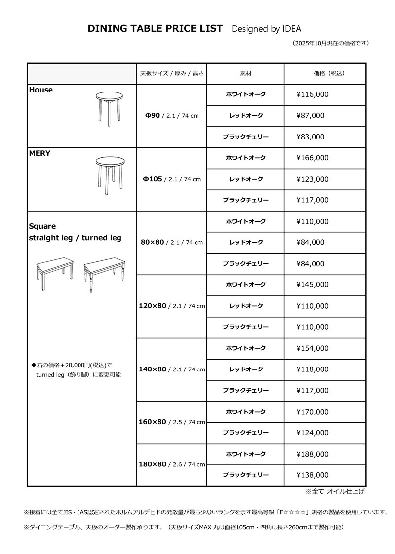 ※ダイニングテーブル、天板のオーダー製作承ります。(天板サイズMAX 丸は直径105cm・四角は長さ260cmまで製作可能)